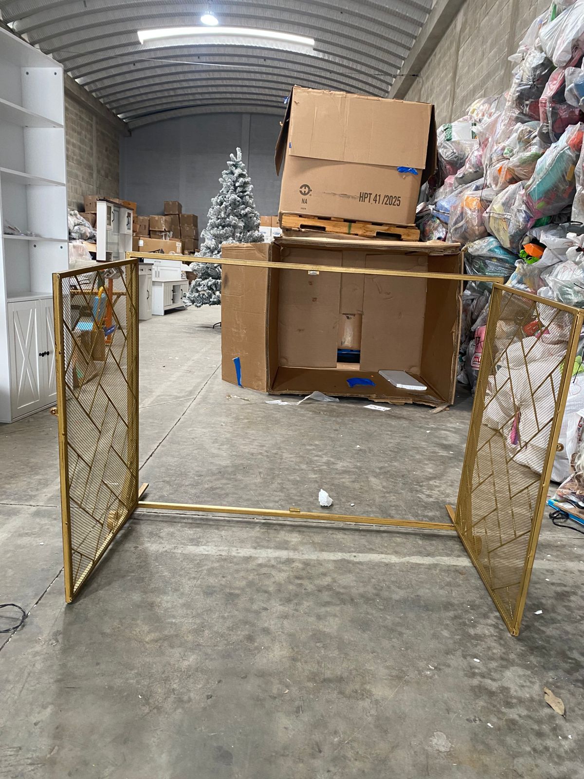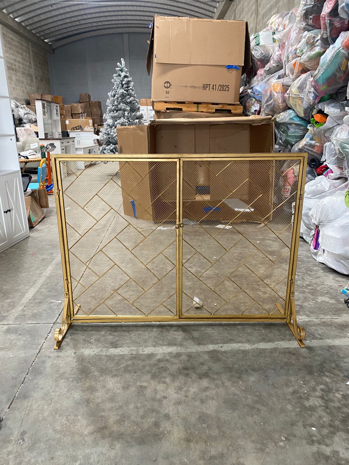 Elegante protector de chimenea metálico en color dorado, ideal para darle un toque moderno y sofisticado a tu sala mientras brinda seguridad y protección contra chispas, brasas o fuego directo.